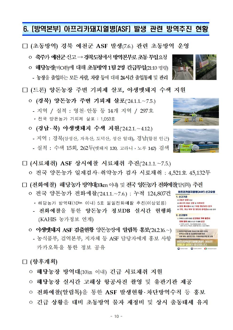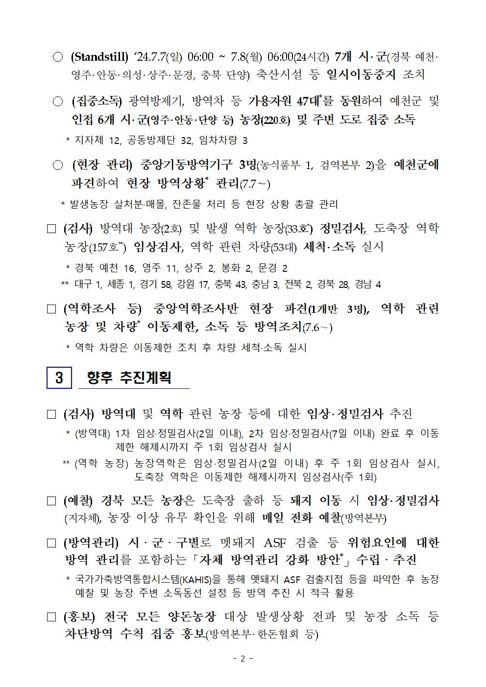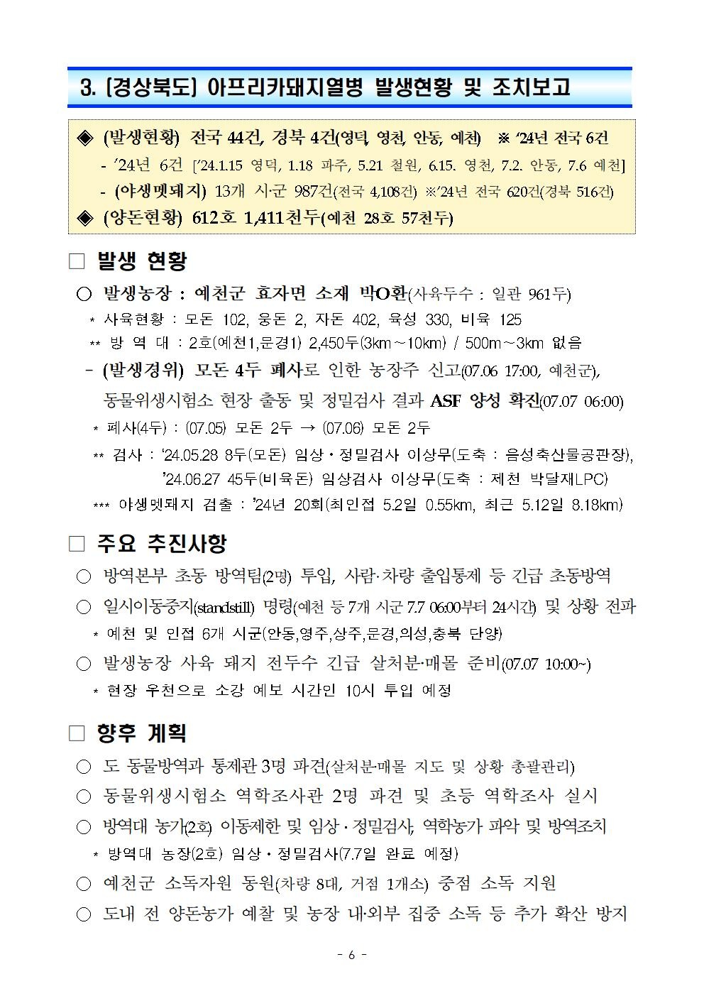 방역당국은 ASF 확산 방지를 위해 7일 6시부터 8일 6시까지 24시간 동안 경북 6개 시군(예천,문경,상주,의성,안동,영주)과 충북 단양 등 모두 7개 시군의 양돈농장?도축장?사료공장 등 축산관계시설 종사자 및 차량에 대하여 일시이동중지 명령을 발령했습니다.