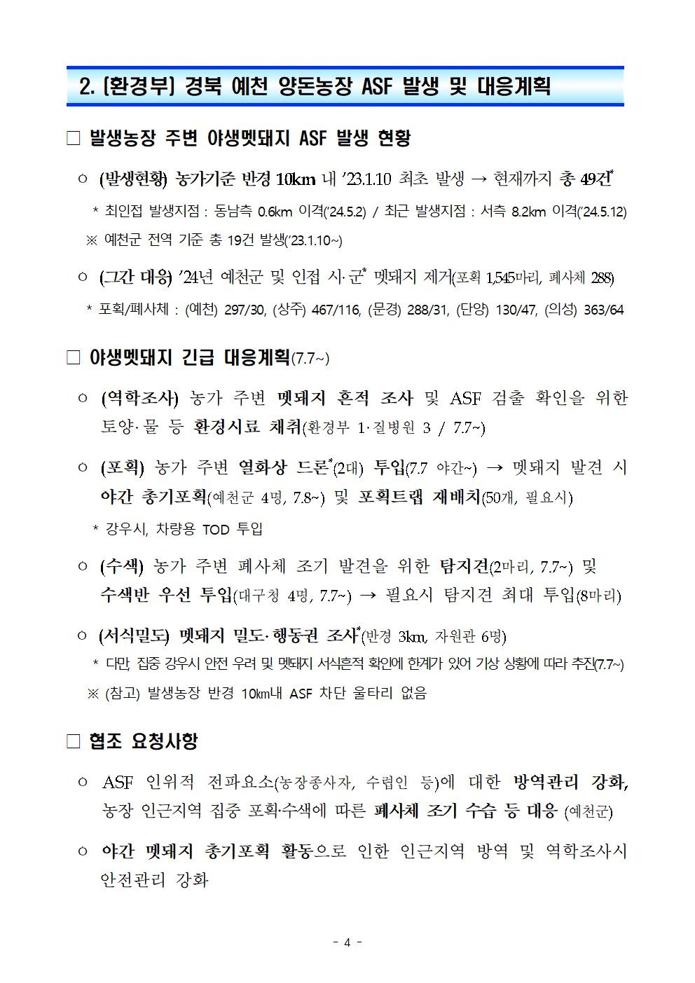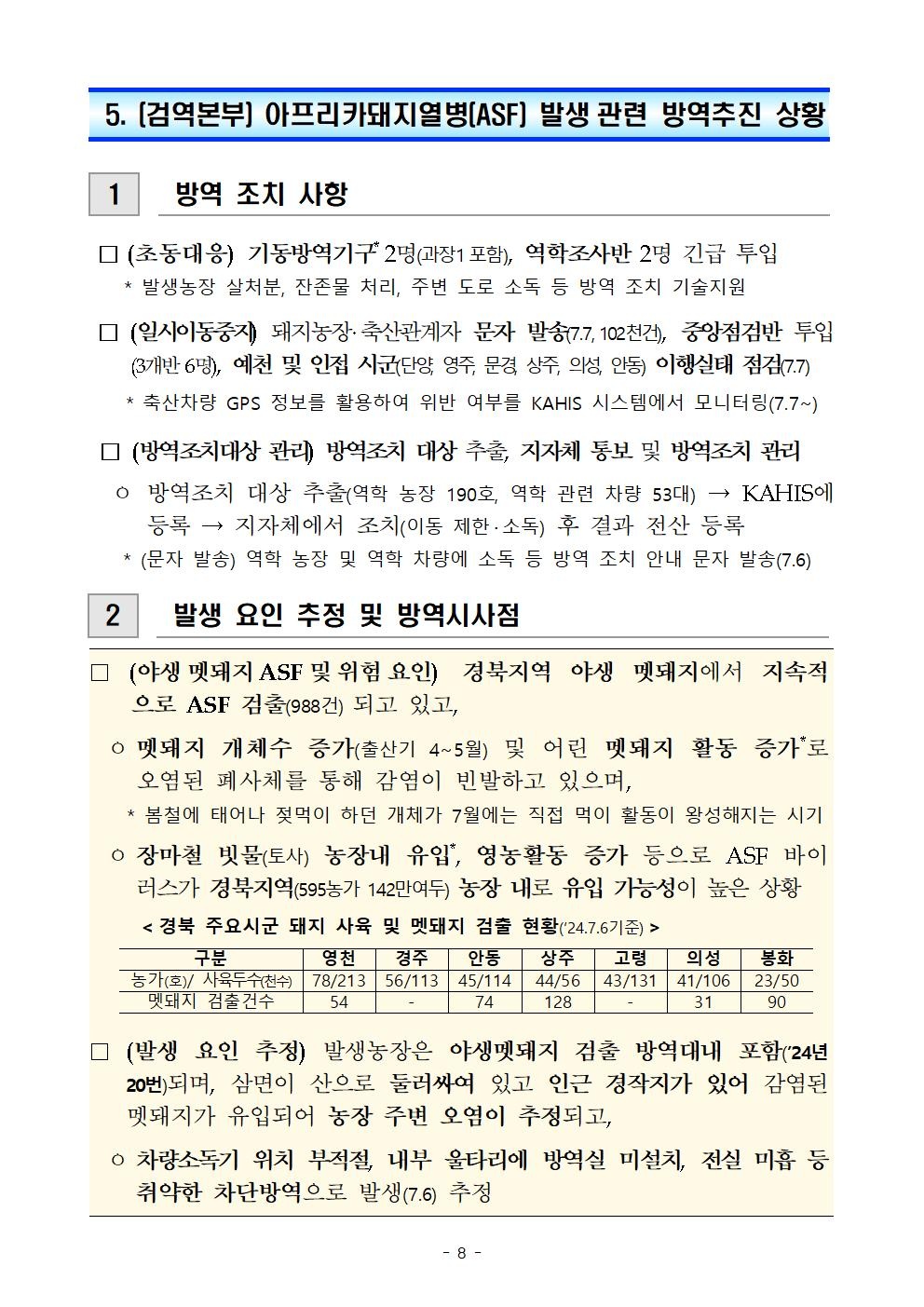 또한, 경북 지역에서 집중적으로 발생하고 있습니다. 전체 6건 가운데 4건입니다(1월 영덕, 6월 영천, 7월 안동·예천). 최근 한 달간 3건 연속으로 양성 사례가 나오고 있습니다. 매우 심각한 상황입니다. 멧돼지를 포함한 전반적인 방역 정책 점검이 필요해 보입니다.