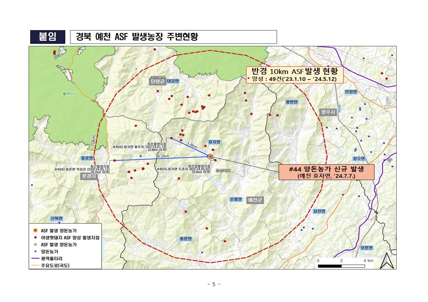 이번 예천 발생농장 돼지는 ASF 긴급행동지침(SOP)에 따라 모두 살처분될 예정입니다. 발생농장을 중심으로 반경 10km 내 2개 농장(2,450두)을 비롯해 농장·도축장 역학농장, 농장 출입차량에 대해서는 이동제한 명령이 내려지고 정밀·임상검사가 실시될 예정입니다.