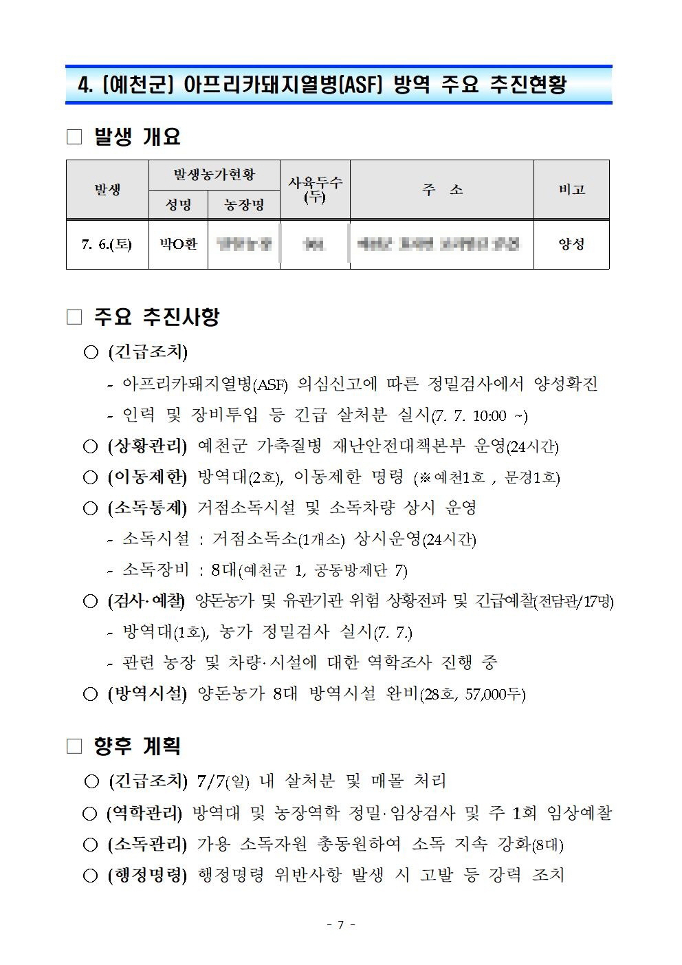 그리고 오늘(7일) 새벽 6시경 경북 동물위생시험소의 정밀검사 결과 ASF 양성(16두 중 6두)으로 진단되었습니다. 역대 44번째 사육돼지 ASF 감염 사례로 기록되었습니다.