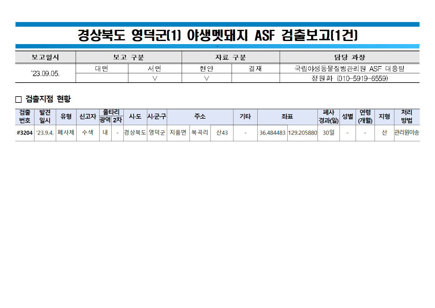- 8.22일 경북 영덕 소재 주왕산 국립공원서 첫 감염멧돼지 발견