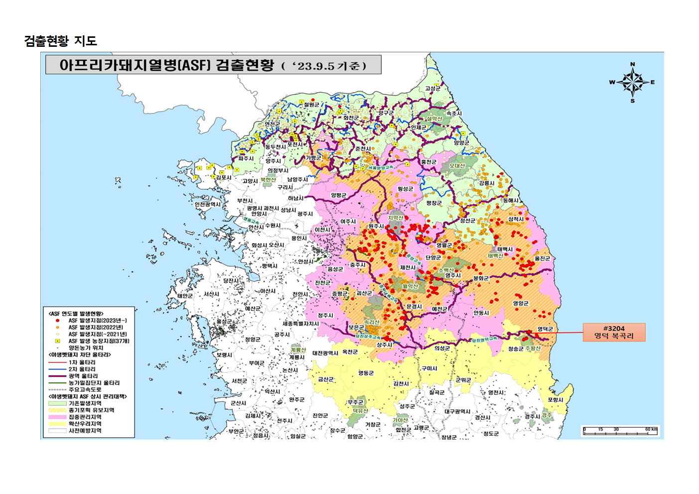 - 9.3일 경북 봉화 소재 청량산 도립공원서 감염멧돼지 확인(8.31 폐사체로 발견)