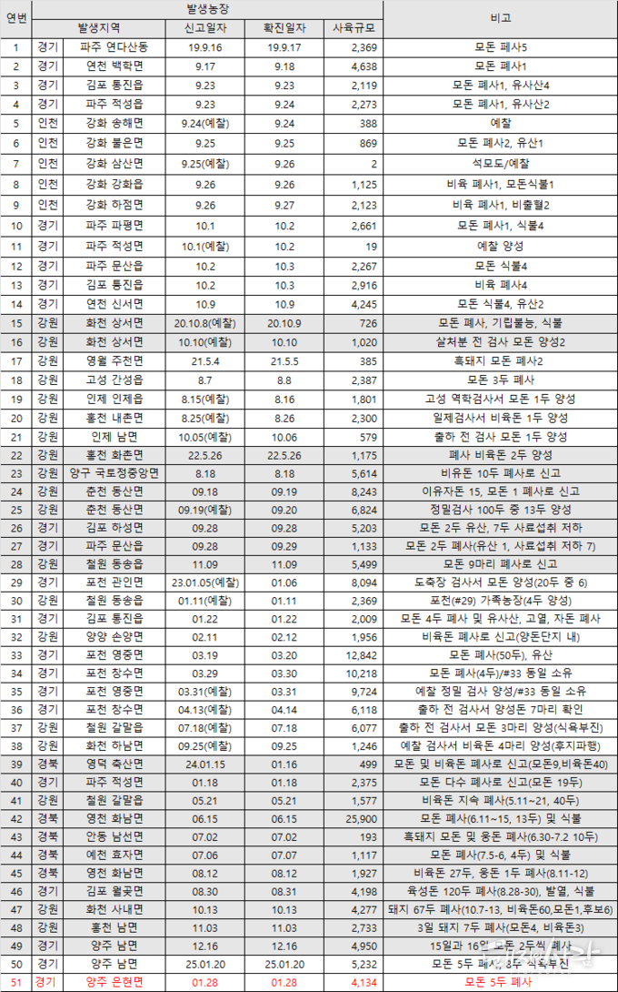 ▶(확진농가) 누적 기준 51건(파주7, 연천2, 김포5, 포천5, 강화5, 화천4, 영월1, 고성1, 인제2, 홍천3, 양구1, 춘천2, 철원4, 양양1, 영덕1, 영천2, 안동1, 예천1, 양주3)