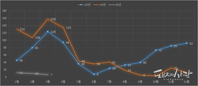 - '25.1.20 경기 양주 남면 사육돼지(5232두 규모) ASF 발생...경기 7개 시군 24시간 스탠드스틸 발령