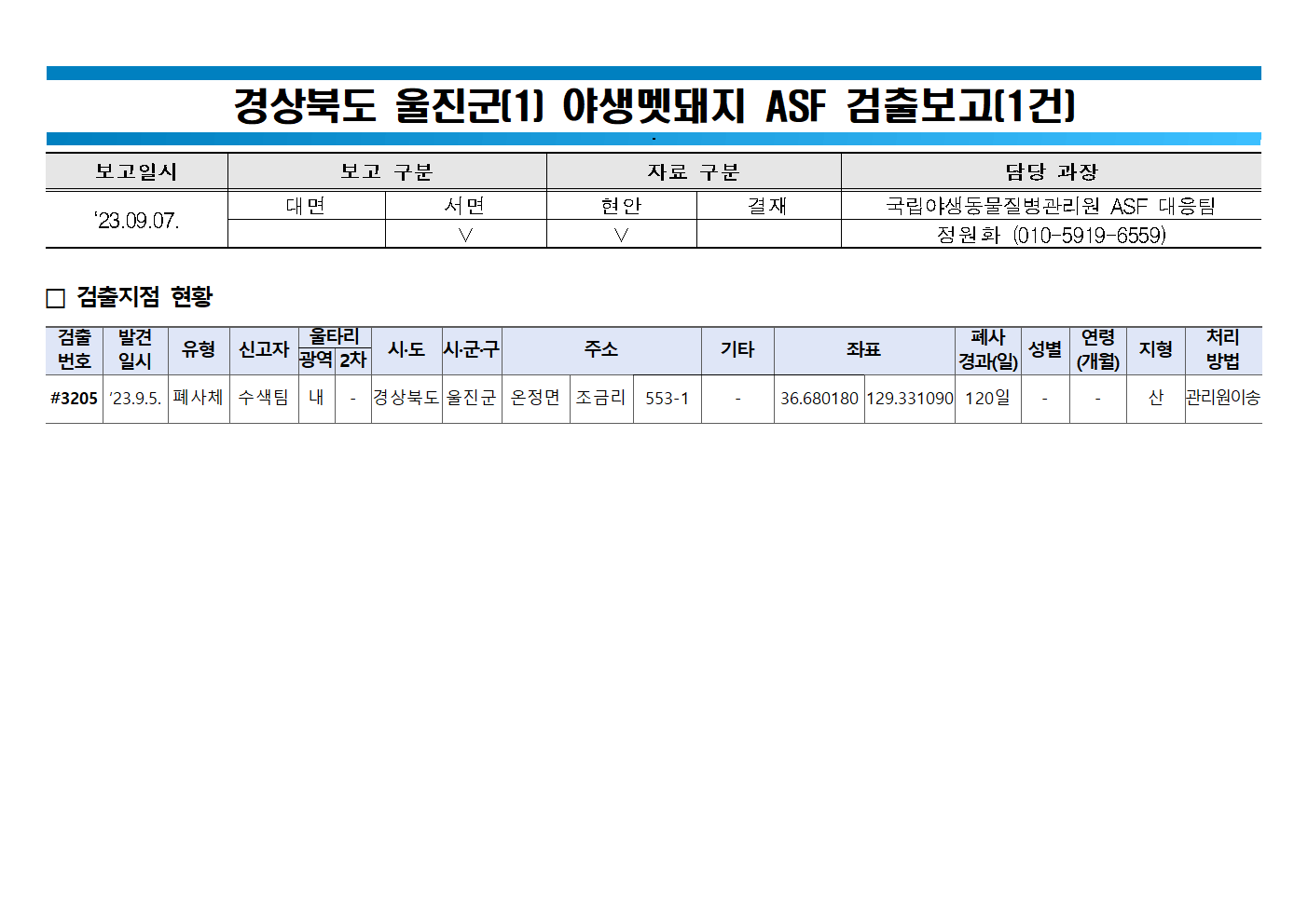 - 16일 경북 상주 차단울타리 밖 감염멧돼지 추가(#3046)