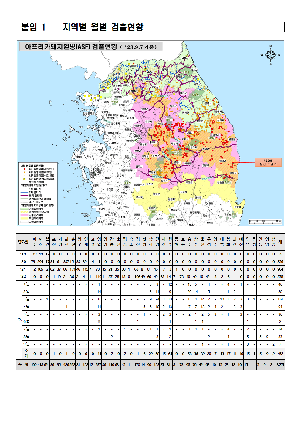▶(야생멧돼지) ASF검출 4개 도, 38개 시군 3205건(연천418, 철원37, 파주100, 화천426, 양구81, 고성12, 포천94, 인제158, 춘천222, 가평62, 영월237 양양36, 강릉110, 홍천63, 평창45, 속초1, 정선170, 횡성63, 삼척90, 단양153, 제천85, 원주81, 동해8, 보은73, 충주98, 상주76, 울진42, 문경62, 영주10, 태백15, 봉화23, 괴산12, 예천10, 영덕15. 음성1, 안동5, 영양9, 청송2)@돼지와사람
