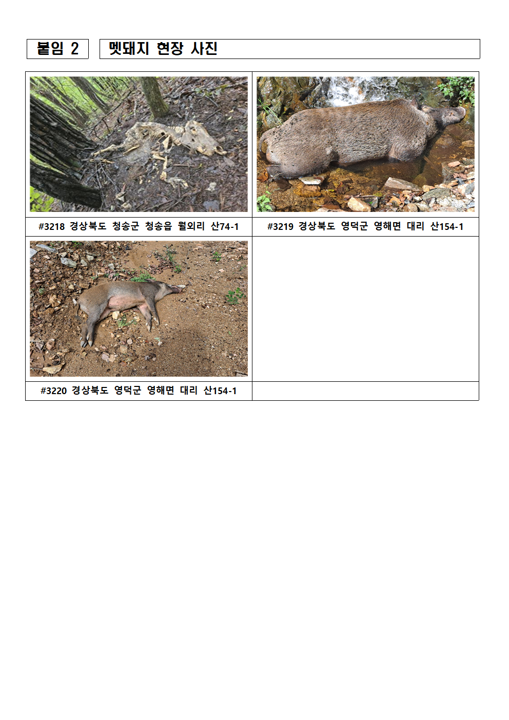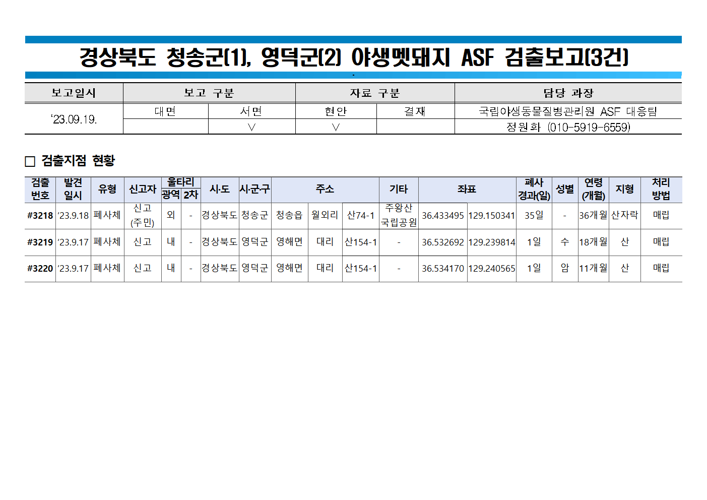 - 9.3일 경북 봉화 소재 청량산 도립공원서 감염멧돼지 확인(8.31 폐사체로 발견)