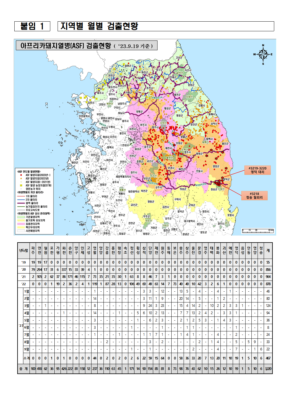 ◈ (발 생) 일반돼지 37건(경기17, 인천5, 강원15), 야생멧돼지 3220건(경기 674, 강원 1857, 충북 422, 경북 267)