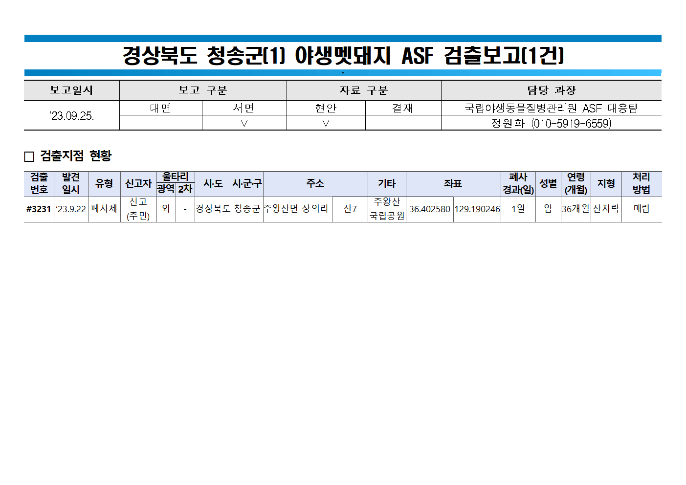 - 9.3일 경북 봉화 소재 청량산 도립공원서 감염멧돼지 확인(8.31 폐사체로 발견)