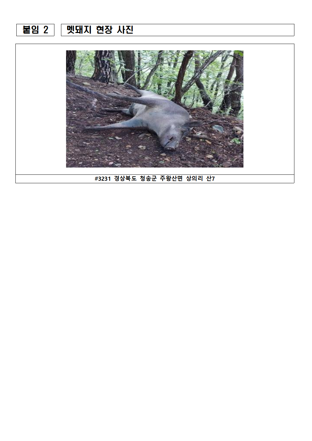 - 8.22일 경북 영덕 소재 주왕산 국립공원서 첫 감염멧돼지 발견