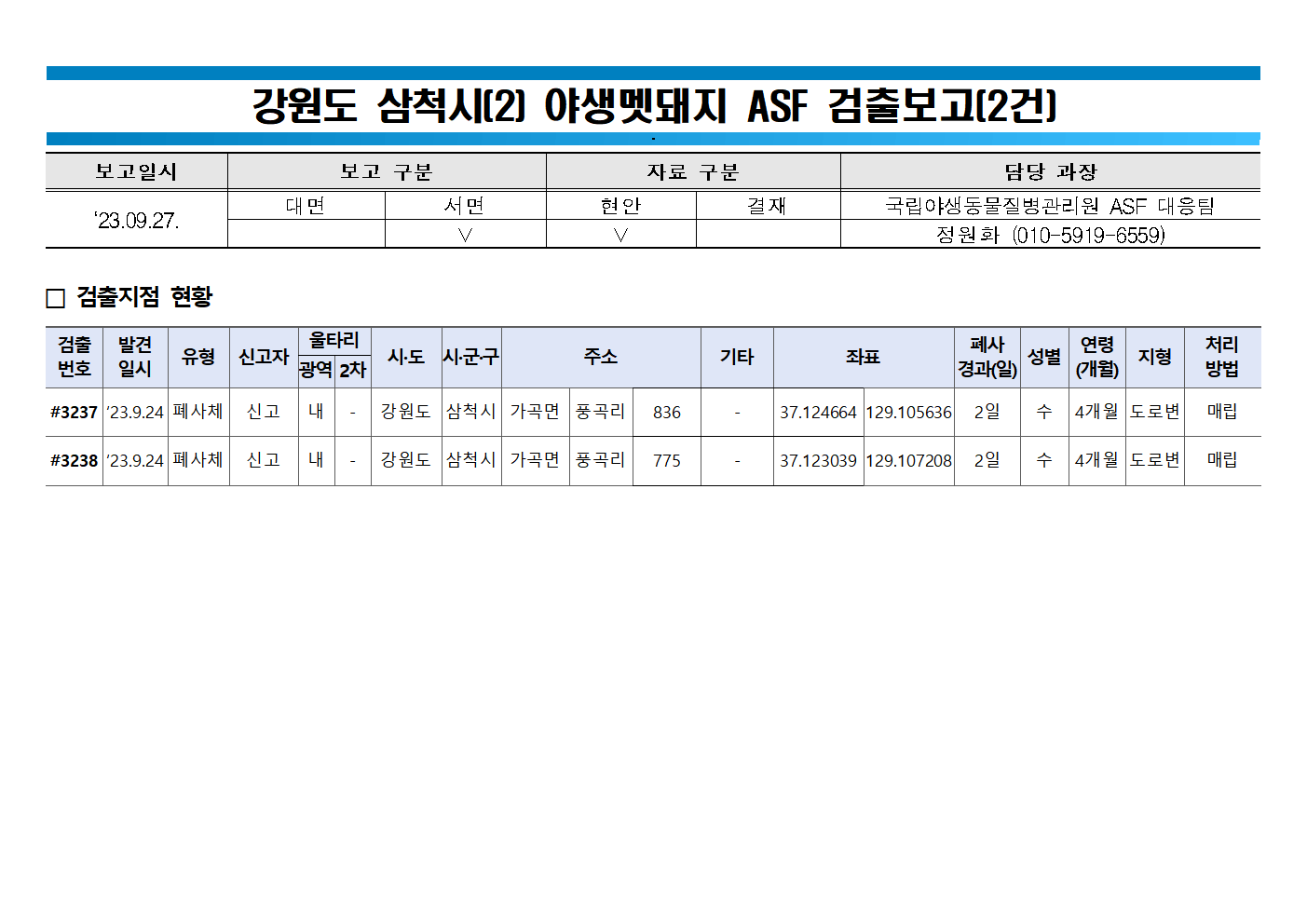 - 9.3일 경북 봉화 소재 청량산 도립공원서 감염멧돼지 확인(8.31 폐사체로 발견)