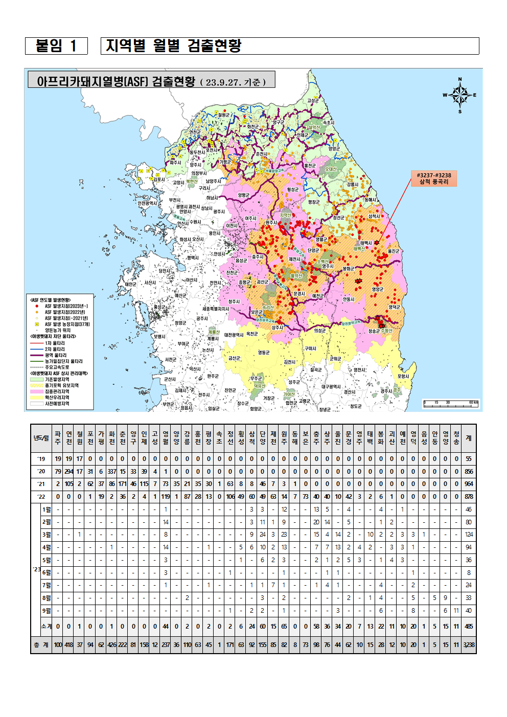 ▶(야생멧돼지) ASF검출 4개 도, 38개 시군 3238건(연천418, 철원37, 파주100, 화천426, 양구81, 고성12, 포천94, 인제158, 춘천222, 가평62, 영월237 양양36, 강릉110, 홍천63, 평창45, 속초1, 정선171, 횡성63, 삼척92, 단양155, 제천85, 원주82, 동해8, 보은73, 충주98, 상주76, 울진44, 문경62, 영주10, 태백15, 봉화28, 괴산12, 예천10, 영덕20. 음성1, 안동5, 영양15, 청송11)@돼지와사람