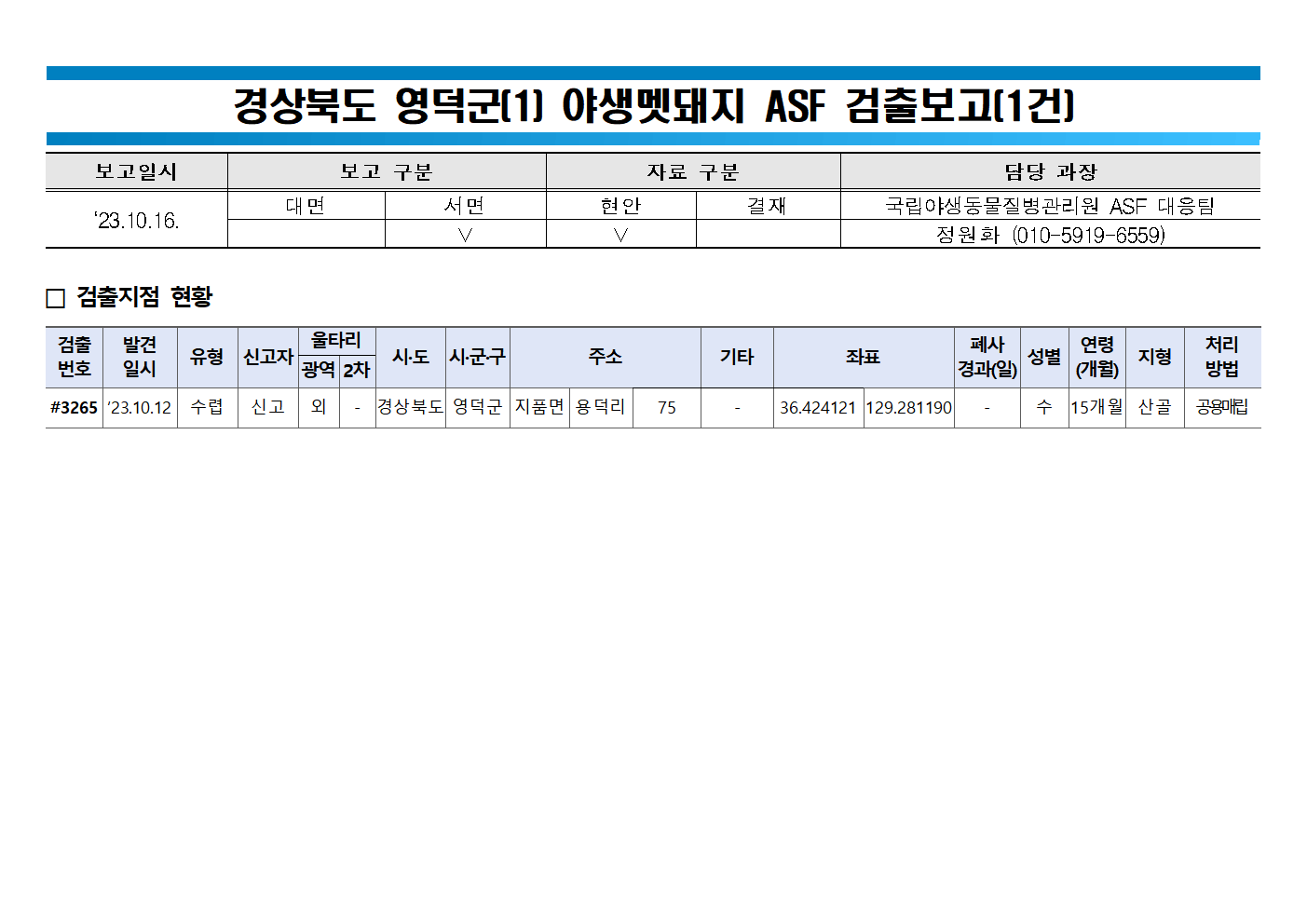 - 16일 경북 상주 차단울타리 밖 감염멧돼지 추가(#3046)
