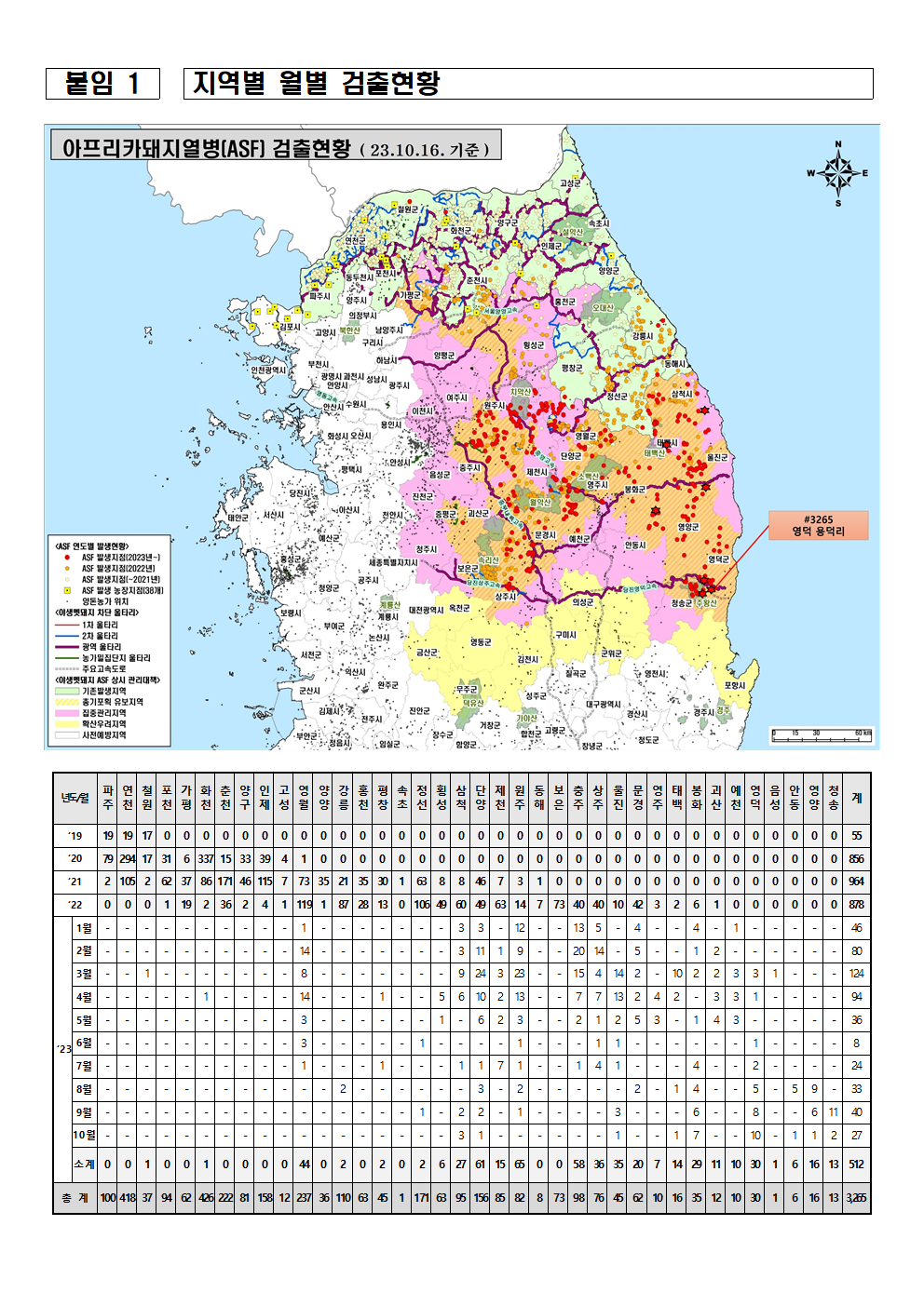 ▶(야생멧돼지) ASF검출 4개 도, 38개 시군 3265건(연천418, 철원37, 파주100, 화천426, 양구81, 고성12, 포천94, 인제158, 춘천222, 가평62, 영월237 양양36, 강릉110, 홍천63, 평창45, 속초1, 정선171, 횡성63, 삼척95, 단양156, 제천85, 원주82, 동해8, 보은73, 충주98, 상주76, 울진45, 문경62, 영주10, 태백16, 봉화35, 괴산12, 예천10, 영덕30. 음성1, 안동6, 영양16, 청송13)@돼지와사람