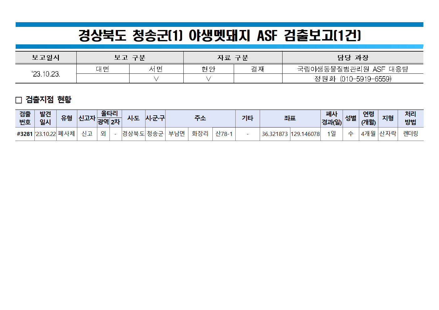 [ASF 실시간 현황판] 감염멧돼지, 23일 1건(청송)