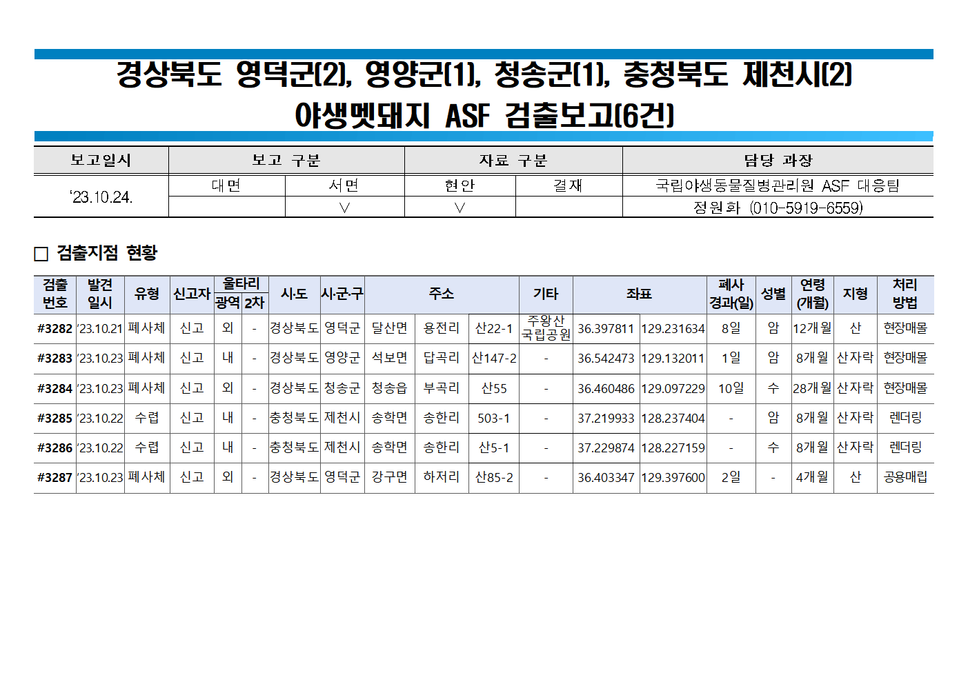[국내 아프리카돼지열병(ASF) 발생 및 의심 관련 정보를 수시 업데이트 예정입니다. 다만, 집계에서 오류가 있을 수 있으니 참고해 보시기 바랍니다. 또한, 해당 페이지에 모든 콘텐츠의 저작권은 없습니다. 출처 표기 후 편하게 사용하시기 바랍니다. -돼지와사람]