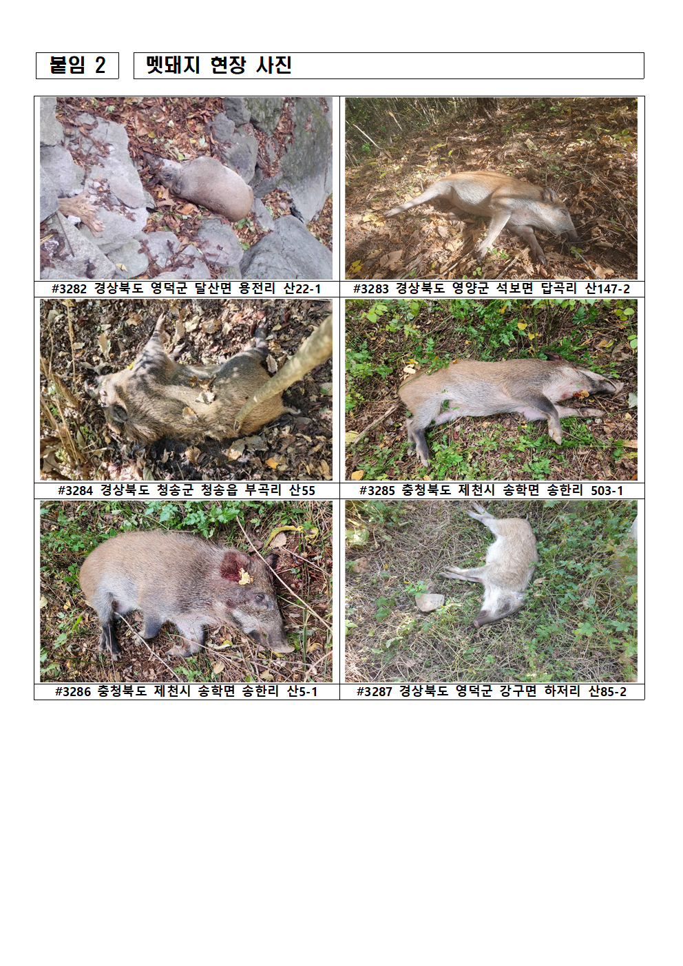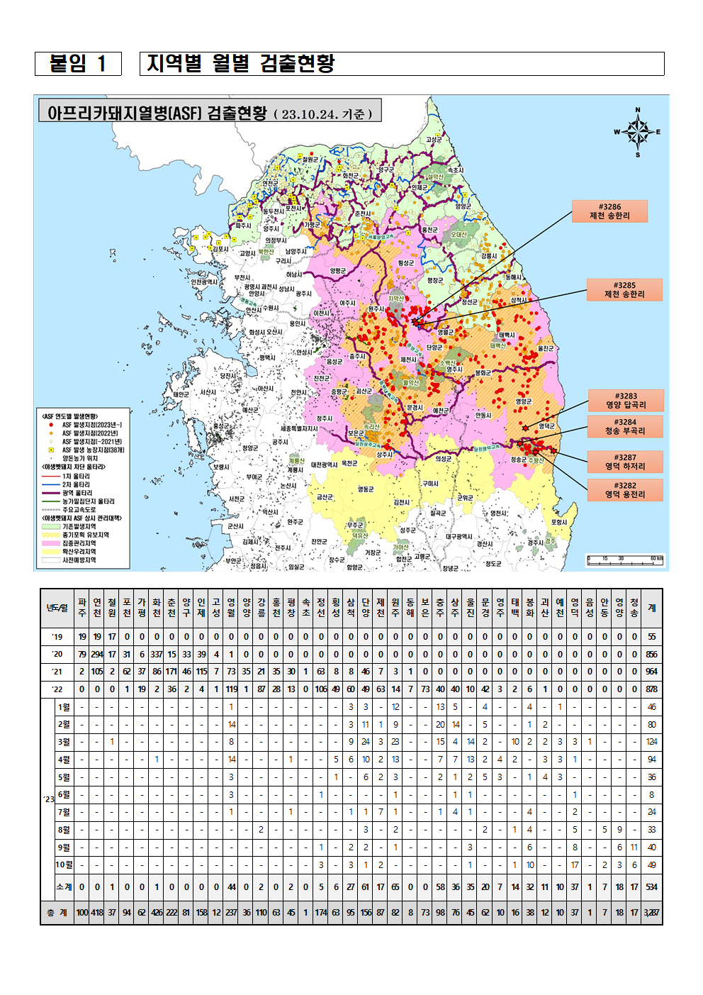 ▶(야생멧돼지) ASF검출 4개 도, 38개 시군 3287건(연천418, 철원37, 파주100, 화천426, 양구81, 고성12, 포천94, 인제158, 춘천222, 가평62, 영월237 양양36, 강릉110, 홍천63, 평창45, 속초1, 정선174, 횡성63, 삼척95, 단양156, 제천87, 원주82, 동해8, 보은73, 충주98, 상주76, 울진45, 문경62, 영주10, 태백16, 봉화38, 괴산12, 예천10, 영덕37, 음성1, 안동7, 영양18, 청송17)@돼지와사람