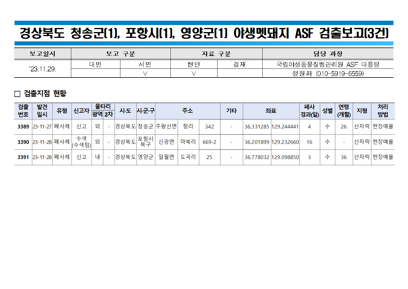 [국내 아프리카돼지열병(ASF) 발생 및 의심 관련 정보를 수시 업데이트 예정입니다. 다만, 집계에서 오류가 있을 수 있으니 참고해 보시기 바랍니다. 또한, 해당 페이지에 모든 콘텐츠의 저작권은 없습니다. 출처 표기 후 편하게 사용하시기 바랍니다. -돼지와사람]