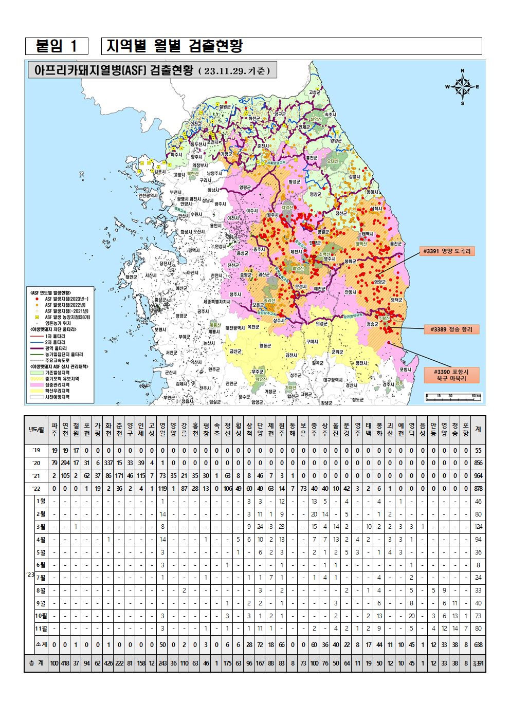 ▶(야생멧돼지) ASF검출 4개 시도, 39개 시군 3391건(연천418, 철원37, 파주100, 화천426, 양구81, 고성12, 포천94, 인제158, 춘천222, 가평62, 영월241, 양양36, 강릉110, 홍천63, 평창46, 속초1, 정선175, 횡성63, 삼척96, 단양167, 제천88, 원주83, 동해8, 보은73, 충주100, 상주76, 울진50, 문경64, 영주11, 태백19, 봉화50, 괴산12, 예천10, 영덕45, 음성1, 안동12, 영양33, 청송38, 포항8)@돼지와사람