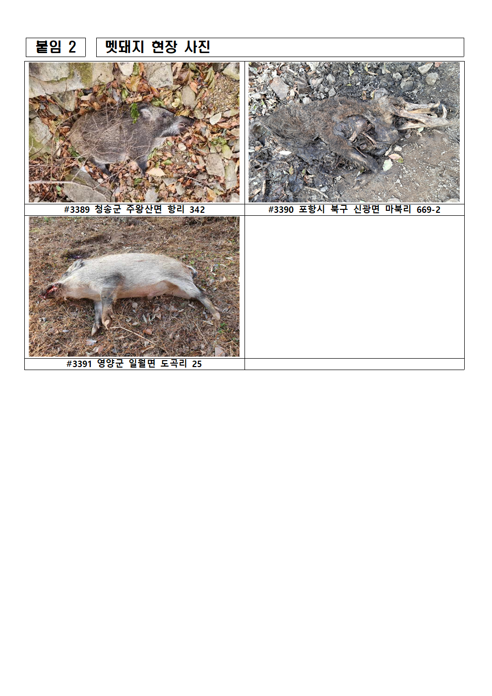 ◈ (발 생) 일반돼지 38건(경기17, 인천5, 강원16), 야생멧돼지 3391건(경기 674, 강원 1879, 충북 441, 경북 397)