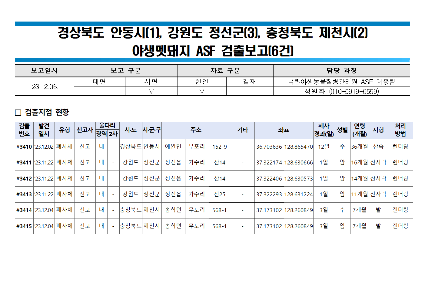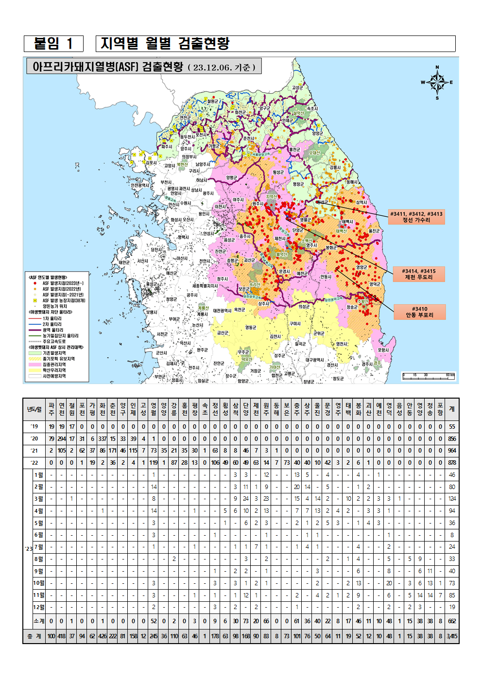 ▶(야생멧돼지) ASF검출 4개 시도, 39개 시군 3415건(연천418, 철원37, 파주100, 화천426, 양구81, 고성12, 포천94, 인제158, 춘천222, 가평62, 영월245, 양양36, 강릉110, 홍천63, 평창46, 속초1, 정선178, 횡성63, 삼척98, 단양168, 제천90, 원주83, 동해8, 보은73, 충주101, 상주76, 울진50, 문경64, 영주11, 태백19, 봉화52, 괴산12, 예천10, 영덕48, 음성1, 안동15, 영양38, 청송38, 포항8)@돼지와사람