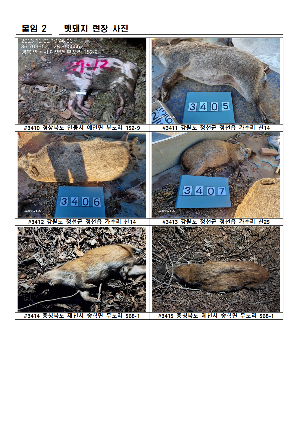 - 강원 15건: 화천(상서면/'20.10.9/10.10, 하남면/'23.09.25), 영월(주천면/'21.5.5), 고성(간성읍/'21.8.8), 인제(인제읍/'21.8.16, 남면/'21.10.6), 홍천(내촌면/'21.8.26, 화촌면/'22.5.26), 양구(국토정중앙면/22.8.18), 춘천(동산면/22.9.19/9.20), 철원(동송읍/'22.11.09, 동송읍/'23.1.11, 갈말읍/'23.7.18), 양양(손양면/'23.2.12)