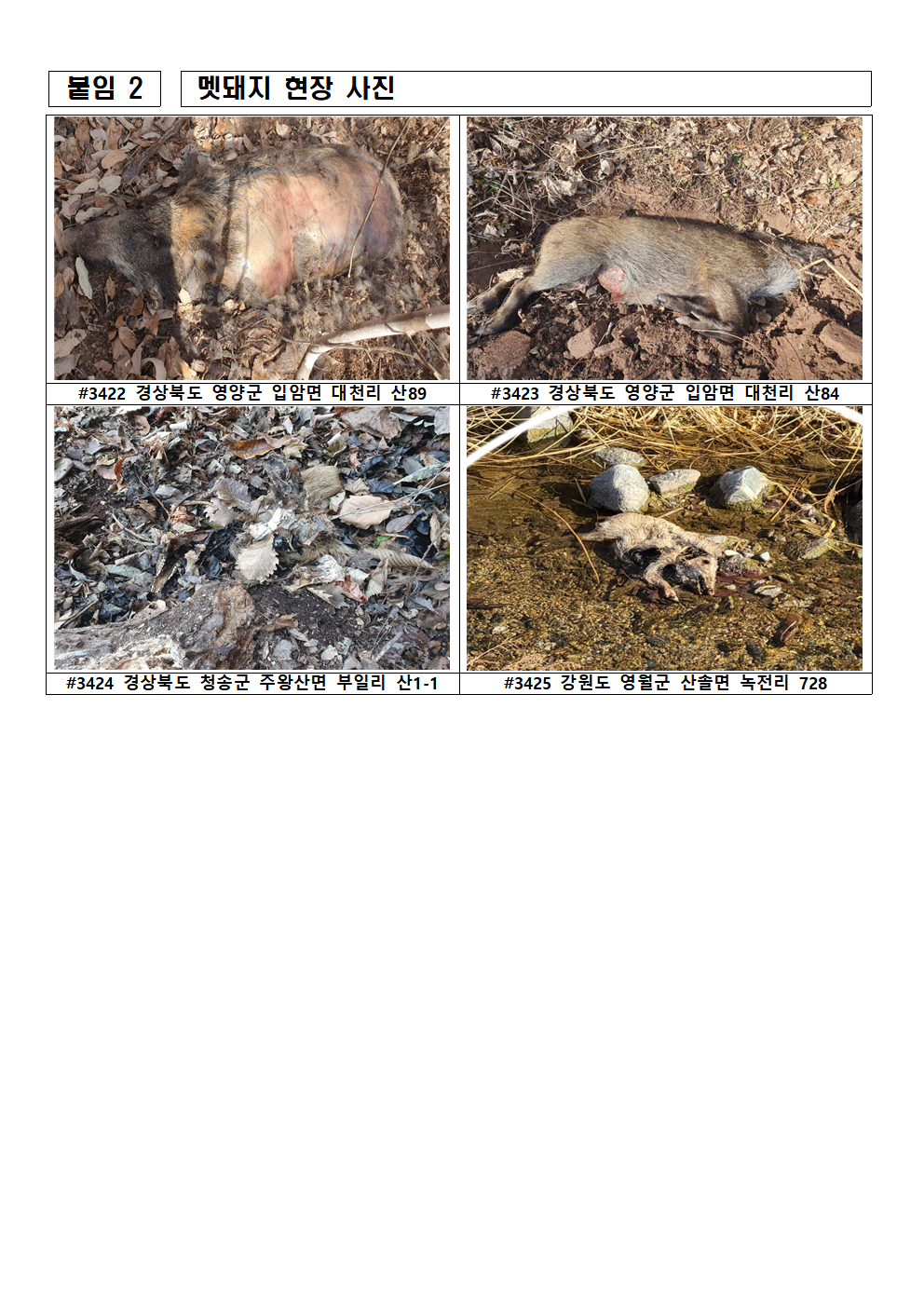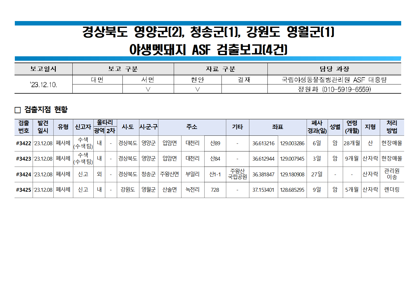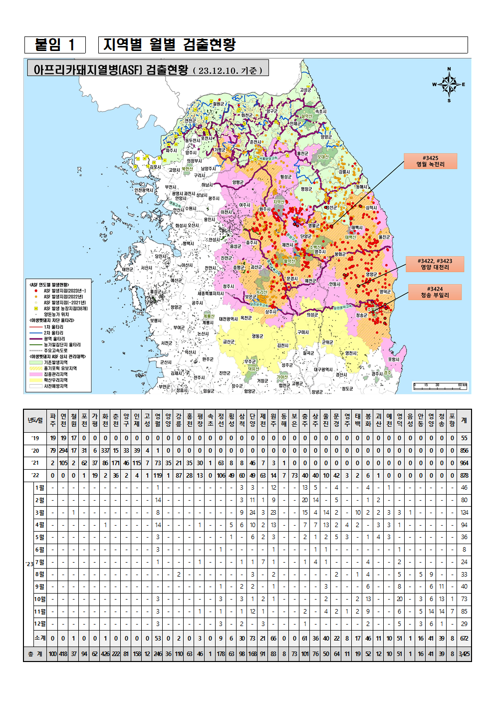 ▶(야생멧돼지) ASF검출 4개 시도, 39개 시군 3425건(연천418, 철원37, 파주100, 화천426, 양구81, 고성12, 포천94, 인제158, 춘천222, 가평62, 영월246, 양양36, 강릉110, 홍천63, 평창46, 속초1, 정선178, 횡성63, 삼척98, 단양168, 제천91, 원주83, 동해8, 보은73, 충주101, 상주76, 울진50, 문경64, 영주11, 태백19, 봉화52, 괴산12, 예천10, 영덕51, 음성1, 안동16, 영양41, 청송39, 포항8)@돼지와사람