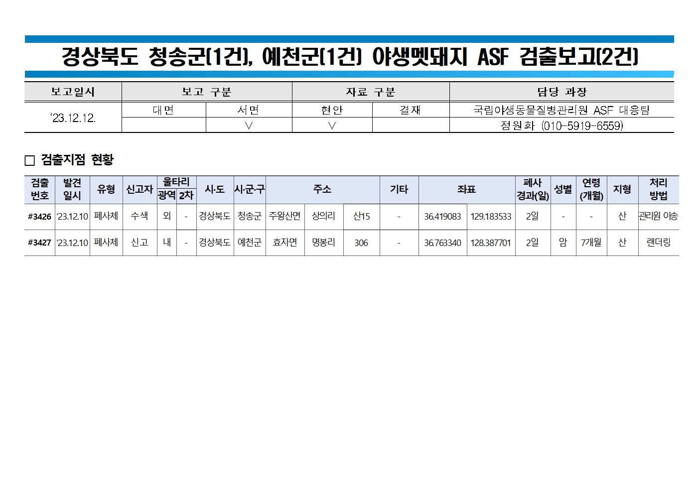 [국내 아프리카돼지열병(ASF) 발생 및 의심 관련 정보를 수시 업데이트 예정입니다. 다만, 집계에서 오류가 있을 수 있으니 참고해 보시기 바랍니다. 또한, 해당 페이지에 모든 콘텐츠의 저작권은 없습니다. 출처 표기 후 편하게 사용하시기 바랍니다. -돼지와사람]