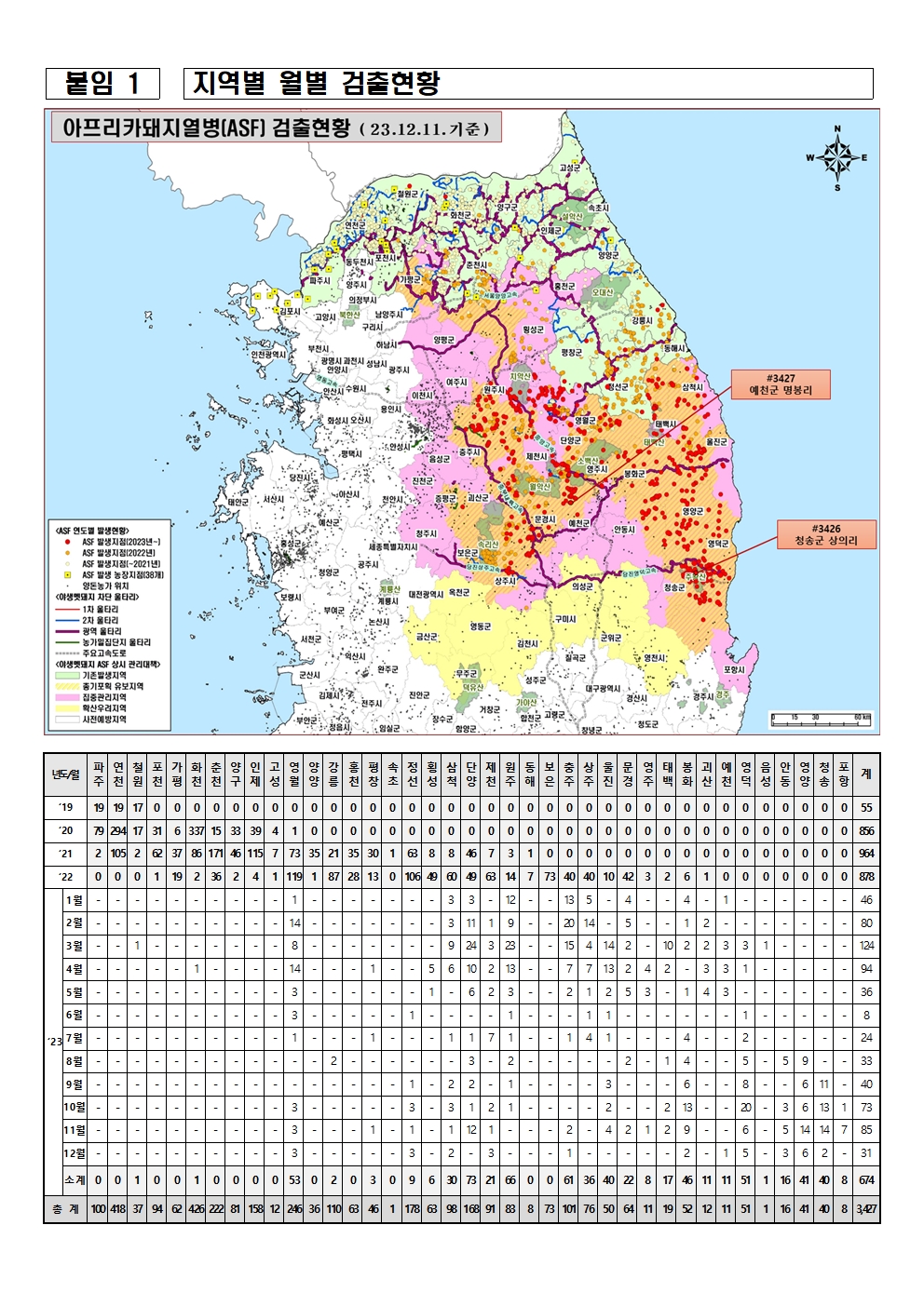 ▶(야생멧돼지) ASF검출 4개 시도, 39개 시군 3427건(연천418, 철원37, 파주100, 화천426, 양구81, 고성12, 포천94, 인제158, 춘천222, 가평62, 영월246, 양양36, 강릉110, 홍천63, 평창46, 속초1, 정선178, 횡성63, 삼척98, 단양168, 제천91, 원주83, 동해8, 보은73, 충주101, 상주76, 울진50, 문경64, 영주11, 태백19, 봉화52, 괴산12, 예천11, 영덕51, 음성1, 안동16, 영양41, 청송40, 포항8)@돼지와사람