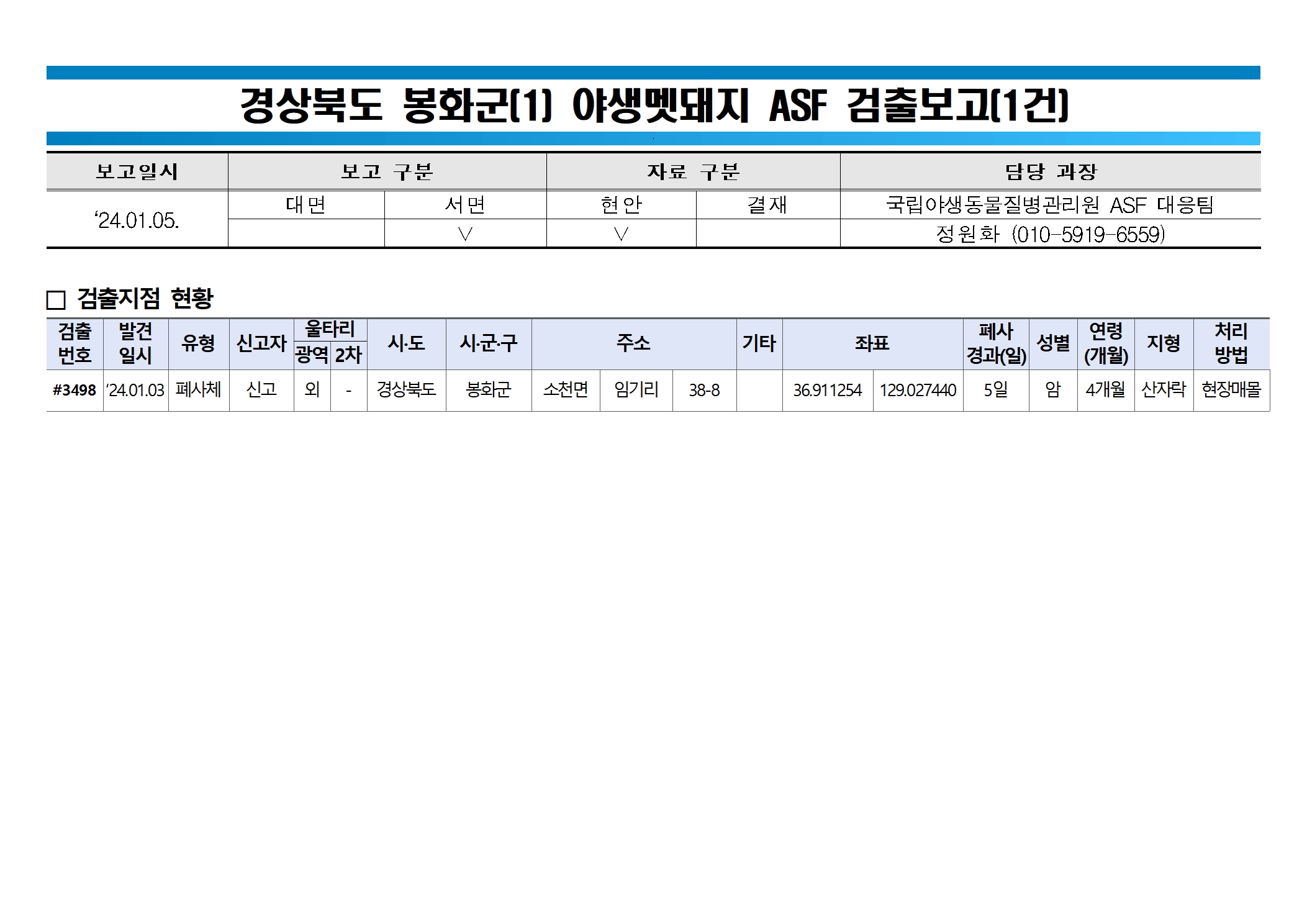 [국내 아프리카돼지열병(ASF) 발생 및 의심 관련 정보를 수시 업데이트 예정입니다. 다만, 집계에서 오류가 있을 수 있으니 참고해 보시기 바랍니다. 또한, 해당 페이지에 모든 콘텐츠의 저작권은 없습니다. 출처 표기 후 편하게 사용하시기 바랍니다. -돼지와사람]