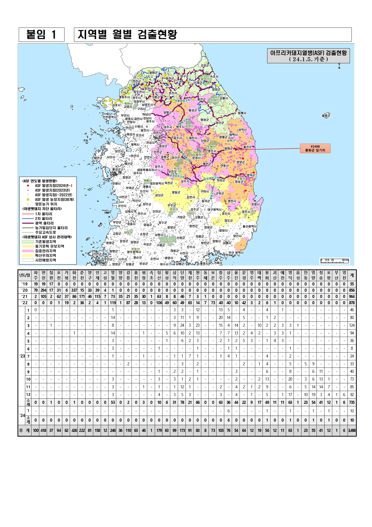 ▶(야생멧돼지) ASF검출 5개 시도, 41개 시군 3498건(연천418, 철원37, 파주100, 화천426, 양구81, 고성12, 포천94, 인제158, 춘천222, 가평62, 영월246, 양양36, 강릉110, 홍천63, 평창46, 속초1, 정선179, 횡성63, 삼척99, 단양173, 제천91, 원주83, 동해8, 보은73, 충주103, 상주82, 울진54, 문경64, 영주12, 태백19, 봉화56, 괴산12, 예천11, 영덕64, 음성1, 안동23, 영양55, 청송41, 포항13, 부산1, 영천6)@돼지와사람