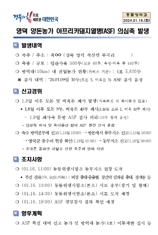 ASF 중앙사고수습본부(본부장 송미령 농림축산식품부장관, 이하 중수본)는 16일 경북 영덕군 축산면 소재 양돈농장(500여마리 사육)에서 ASF 발생이 확인되었다고 밝혔습니다.