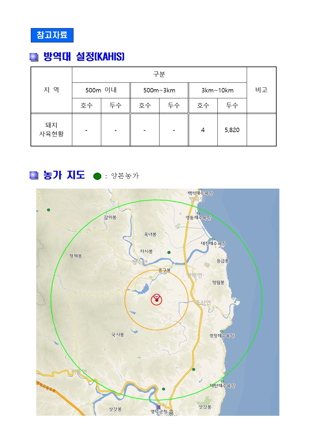 이번 영덕 발생농장 반경 3km 내에는 다른 양돈장은 없고, 반경 3~10km 내에는 4개 농장 돼지 5820마리가 사육 중인 것으로 파악됩니다. 이에 따라 예방적 살처분은 없을 것이며, 다만 이들 농장에 대해서는 이동제한 조치와 함께 정밀검사가 진행될 예정입니다. 가축위생방역지원본부에 따르면 영덕에는 이번 발생농장을 포함해 모두 12농가('22년 12월 기준)가 있는 것으로 알려졌습니다.