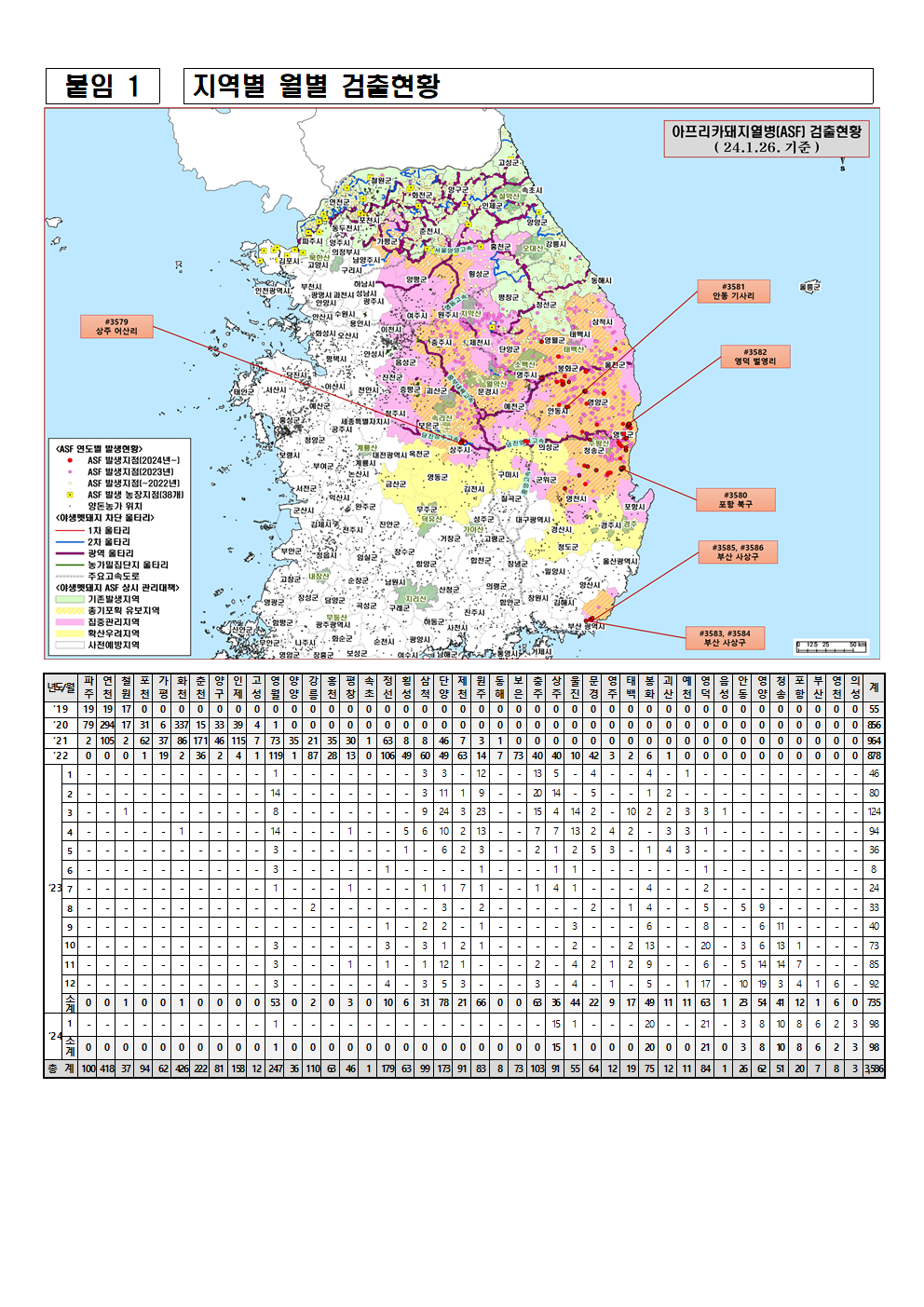 ▶(야생멧돼지) ASF검출 5개 시도, 42개 시군 3586건(연천418, 철원37, 파주100, 화천426, 양구81, 고성12, 포천94, 인제158, 춘천222, 가평62, 영월247, 양양36, 강릉110, 홍천63, 평창46, 속초1, 정선179, 횡성63, 삼척99, 단양173, 제천91, 원주83, 동해8, 보은73, 충주103, 상주91, 울진55, 문경64, 영주12, 태백19, 봉화75, 괴산12, 예천11, 영덕84, 음성1, 안동26, 영양62, 청송51, 포항20, 부산7, 영천8, 의성3)@돼지와사람