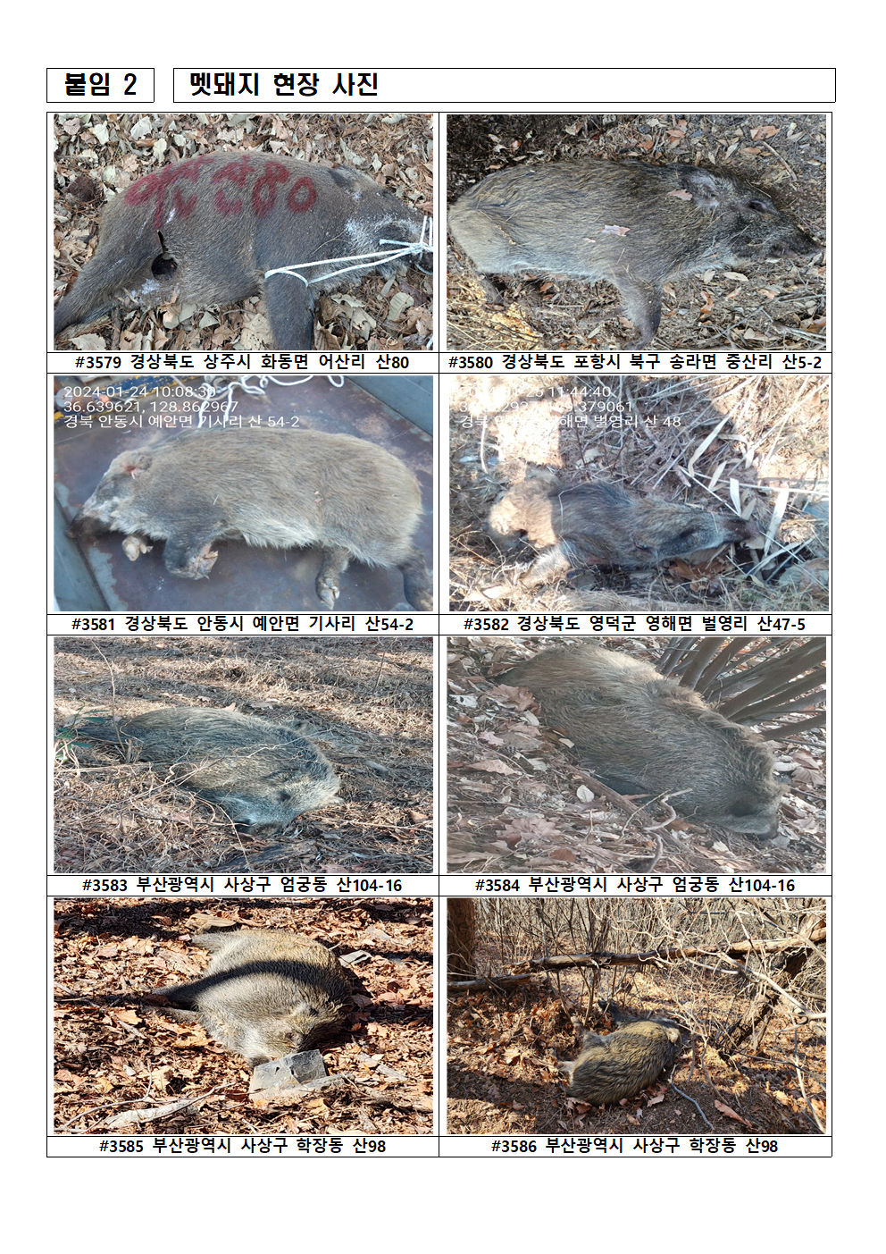 - 경기 17건: 파주 6(연다산동/'19.9.16, 적성면/'19.9.23/'24.01.18, 파평면·적성면/'19.10.2, 문산읍/'19.10.3/'22.9.29), 연천 2(백학면/9.17, 신서면/10.9), 김포 4(통진읍/'19.9.23/10.3/'23.01.22, 하성면/'22.9.28), 포천 4(관인면/'23.01.06, 영중면/'23.03.20/'03.31, 창수면/'23.03.30/04.14)