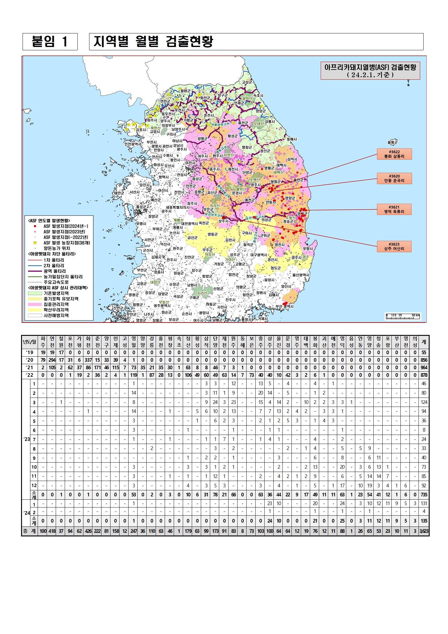 ▶(야생멧돼지) ASF검출 5개 시도, 42개 시군 3623건(연천418, 철원37, 파주100, 화천426, 양구81, 고성12, 포천94, 인제158, 춘천222, 가평62, 영월247, 양양36, 강릉110, 홍천63, 평창46, 속초1, 정선179, 횡성63, 삼척99, 단양173, 제천91, 원주83, 동해8, 보은73, 충주103, 상주100, 울진64, 문경64, 영주12, 태백19, 봉화76, 괴산12, 예천11, 영덕87, 음성1, 안동27, 영양65, 청송53, 포항23, 부산10, 영천11, 의성3)@돼지와사람