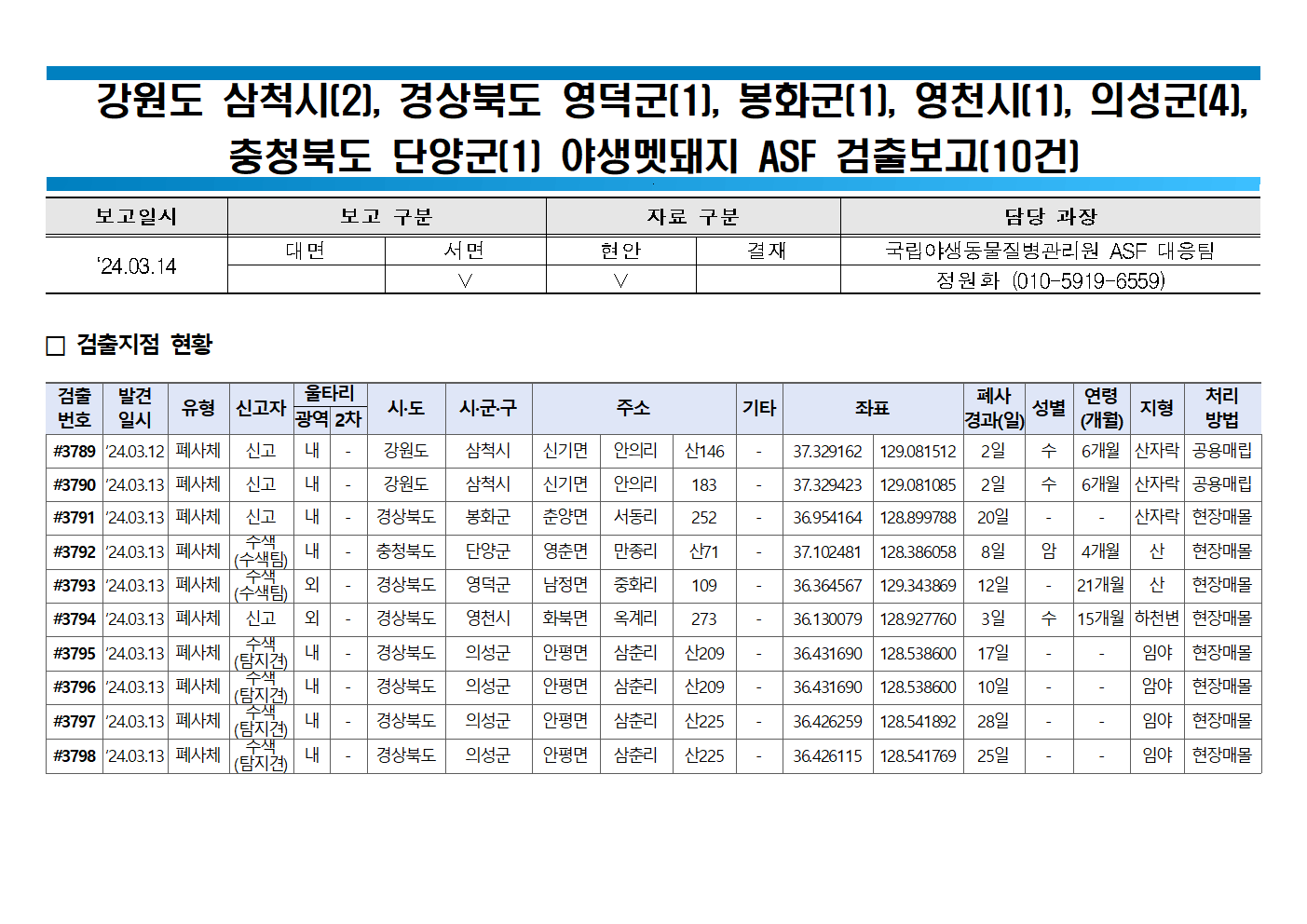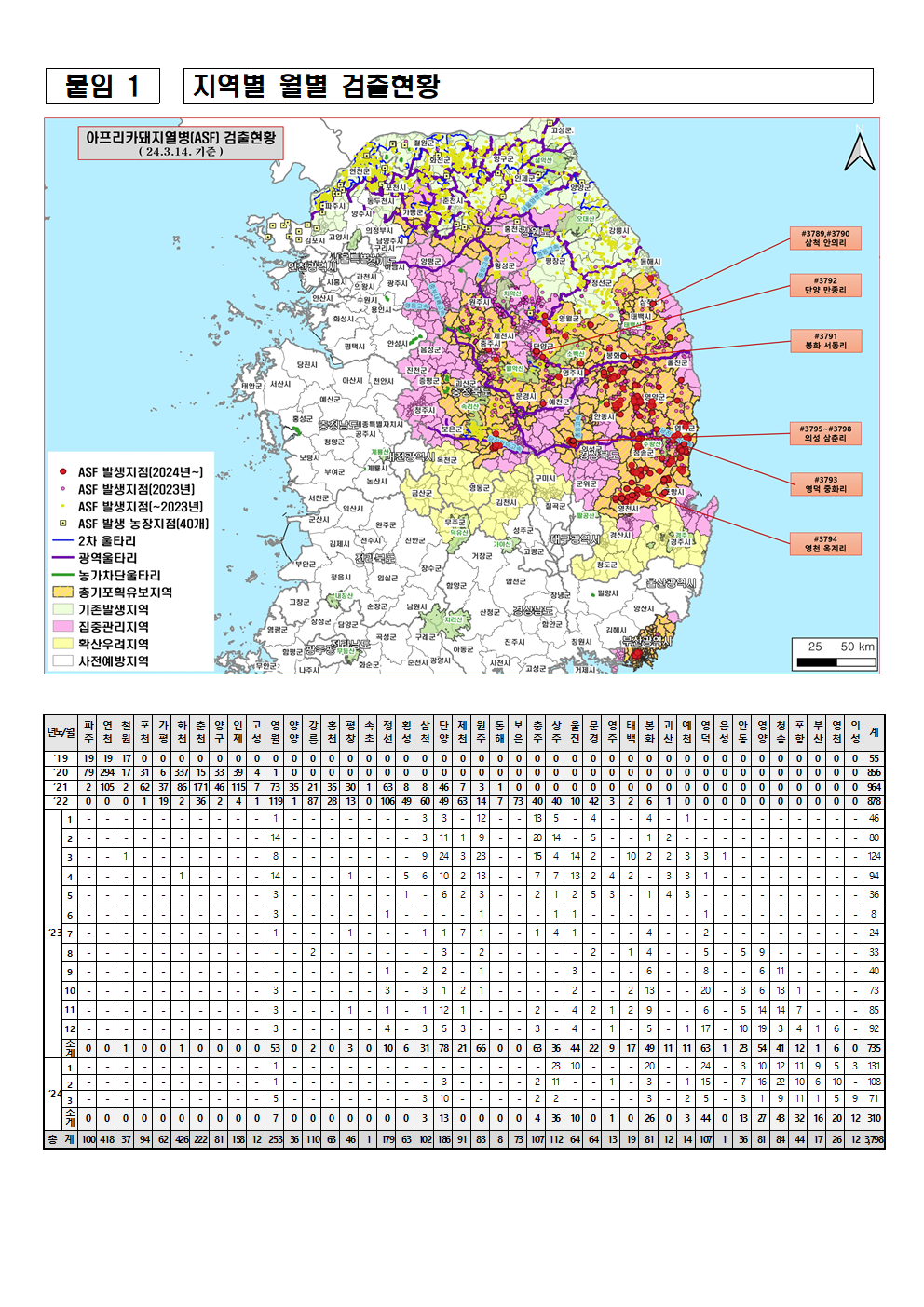 [국내 아프리카돼지열병(ASF) 발생 및 의심 관련 정보를 수시 업데이트 예정입니다. 다만, 집계에서 오류가 있을 수 있으니 참고해 보시기 바랍니다. 또한, 해당 페이지에 모든 콘텐츠의 저작권은 없습니다. 출처 표기 후 편하게 사용하시기 바랍니다. -돼지와사람]