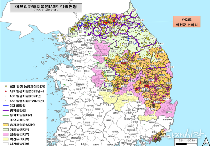 [ASF 실시간 현황판] 야생멧돼지 10.31일 4건(화천), 11.2일 1건(화천) 발생